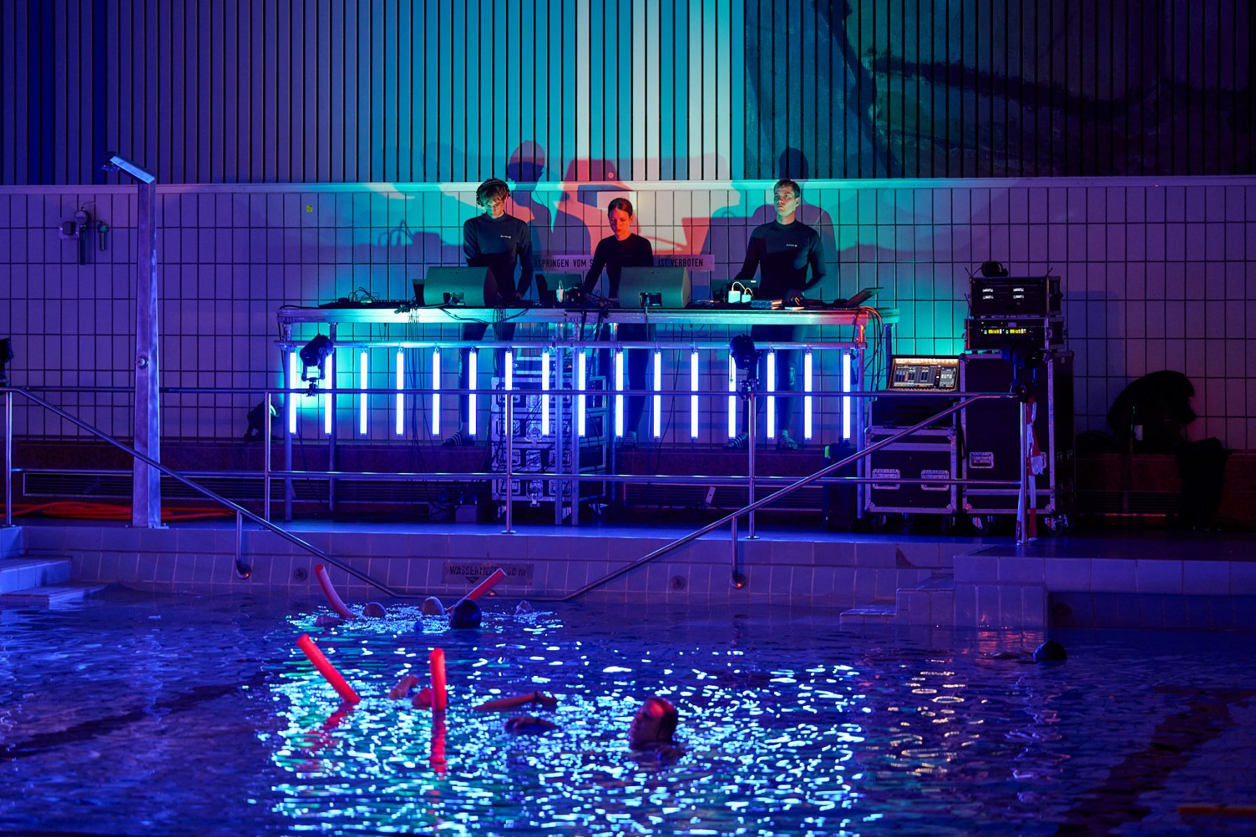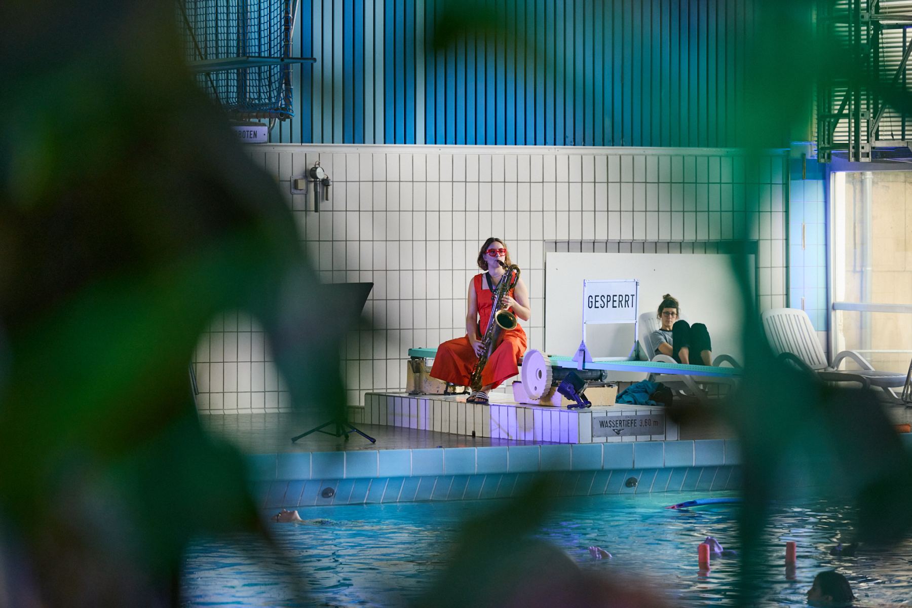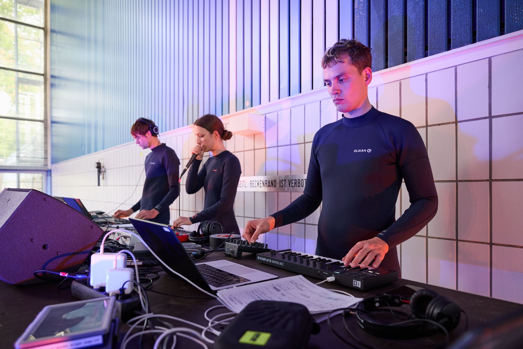 At the end of its »Aquarium« sound and video installation, Trio Wellenbad invites to enjoy entertaining musical performances in the swimming pool. Electronic and instrumental soundscapes can be heard live above and under water as the Frankenbad is transformed into a concert hall. The event concludes with a world premiere for live electronics and instrumental ensemble.