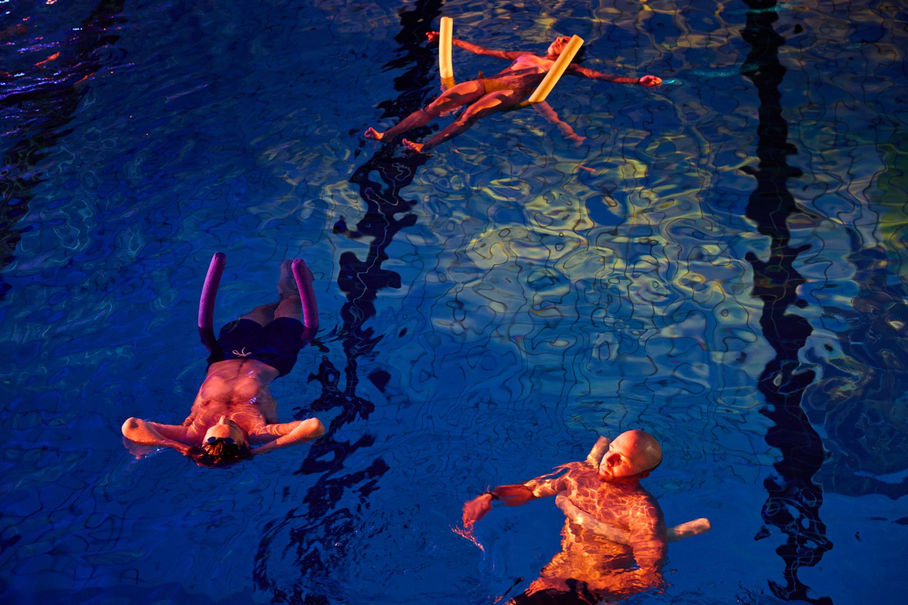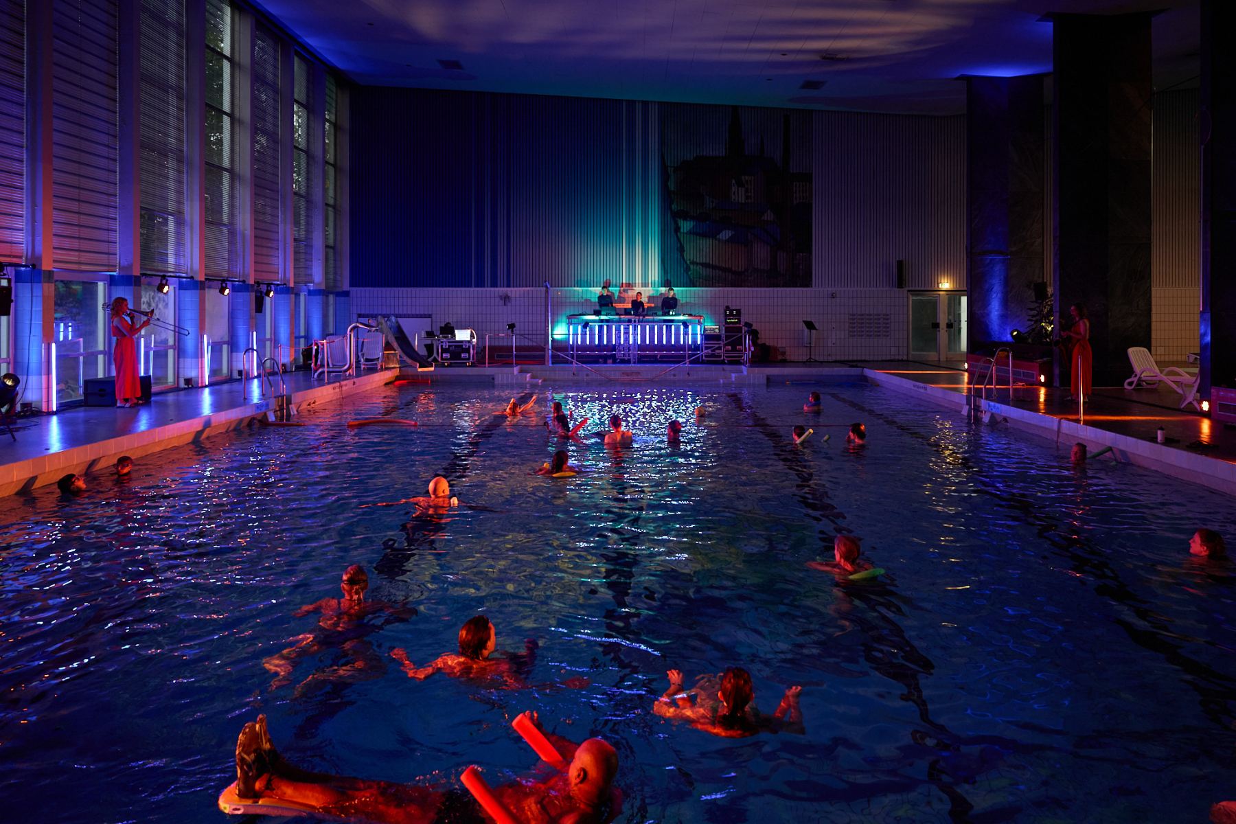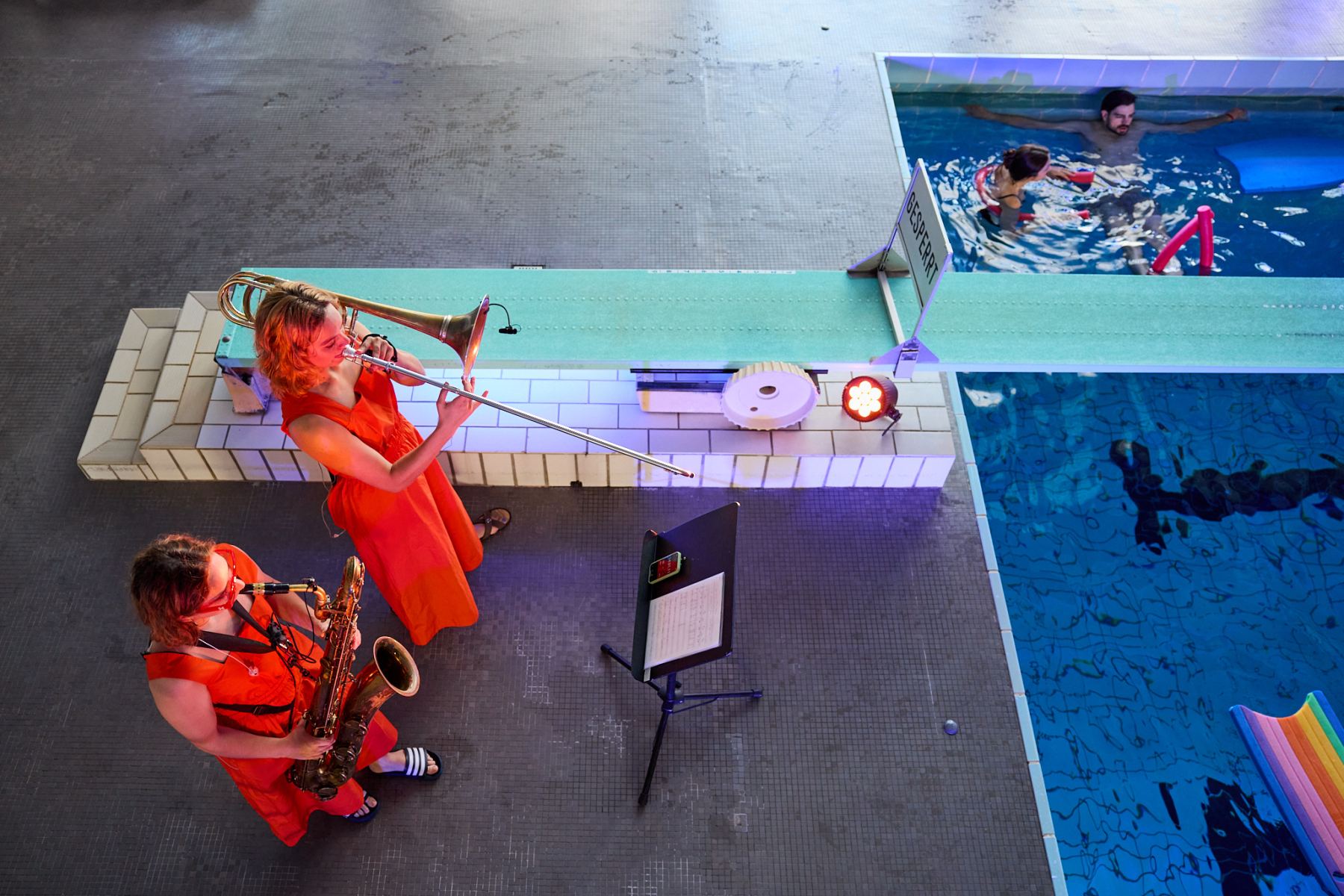At the end of its »Aquarium« sound and video installation, Trio Wellenbad invites to enjoy entertaining musical performances in the swimming pool. Electronic and instrumental soundscapes can be heard live above and under water as the Frankenbad is transformed into a concert hall. The event concludes with a world premiere for live electronics and instrumental ensemble.