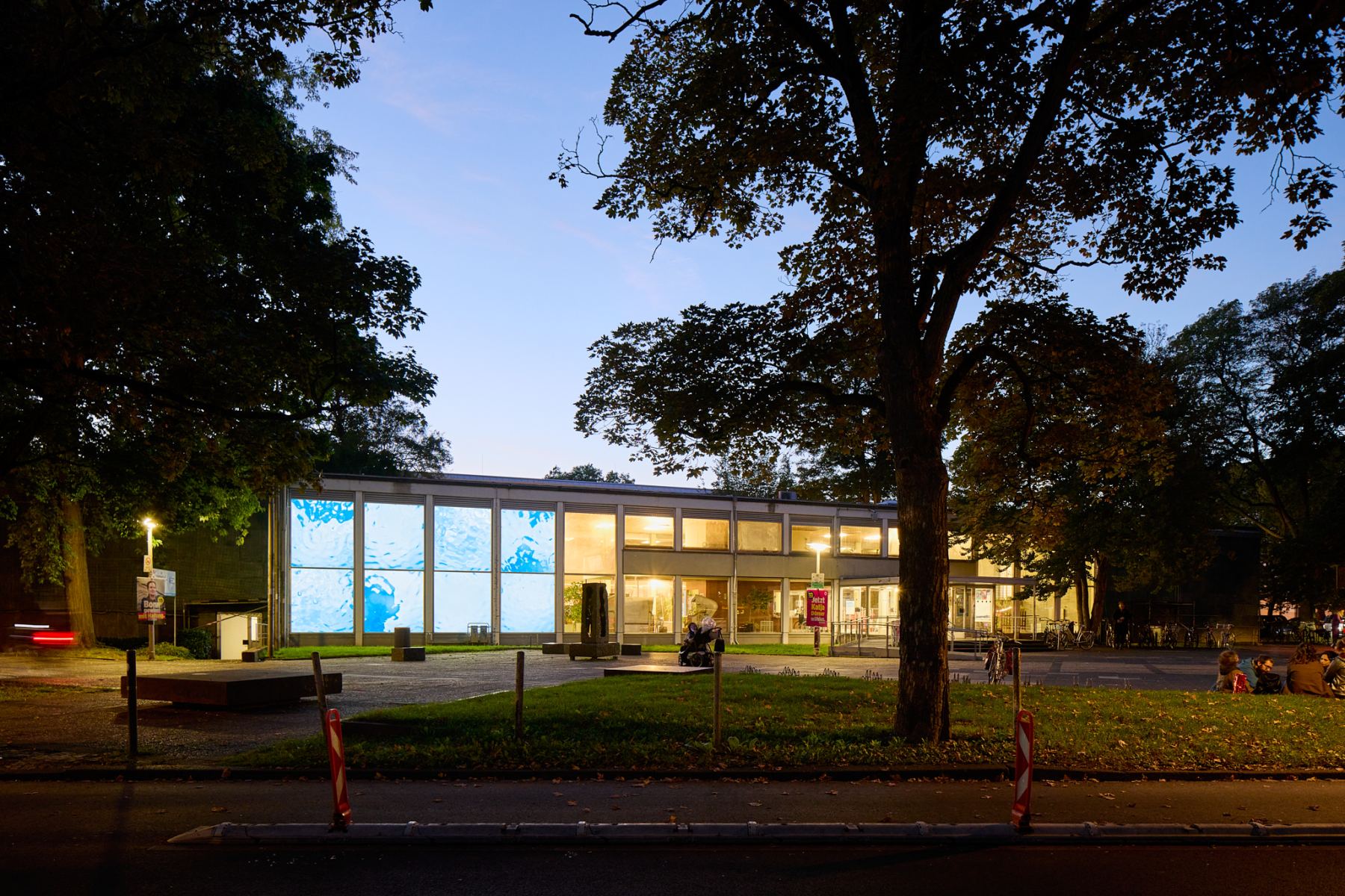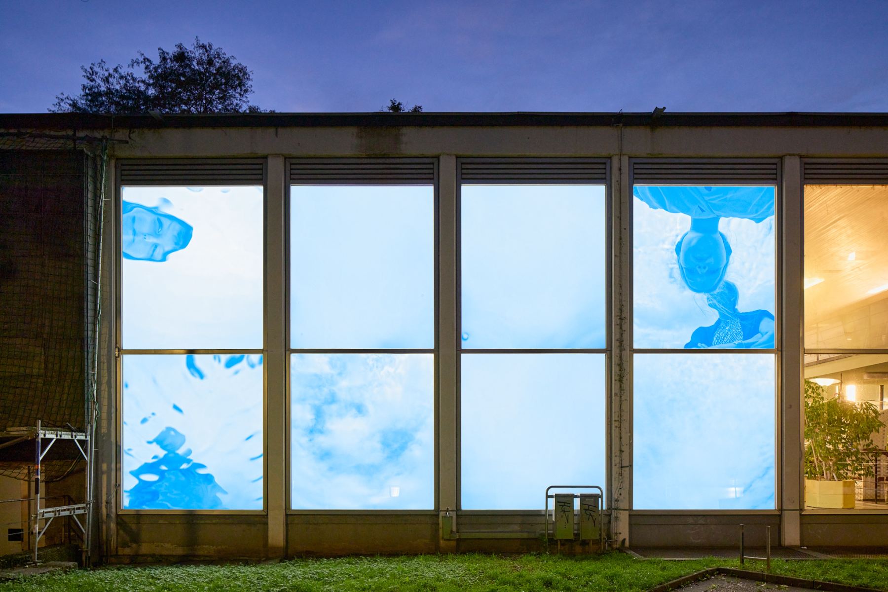 The sound and video installation transforms the entrance facade of the Frankenbad Bonn into an audiovisual membrane between the swimming pool and outdoor space. Resonating glass panes and video projections connect the forecourt with the lobby. The installation is not only for swimmers, but can also be experienced by passers-by throughout the whole day. In the evening, the facade will be transformed into a multimedia aquarium.
